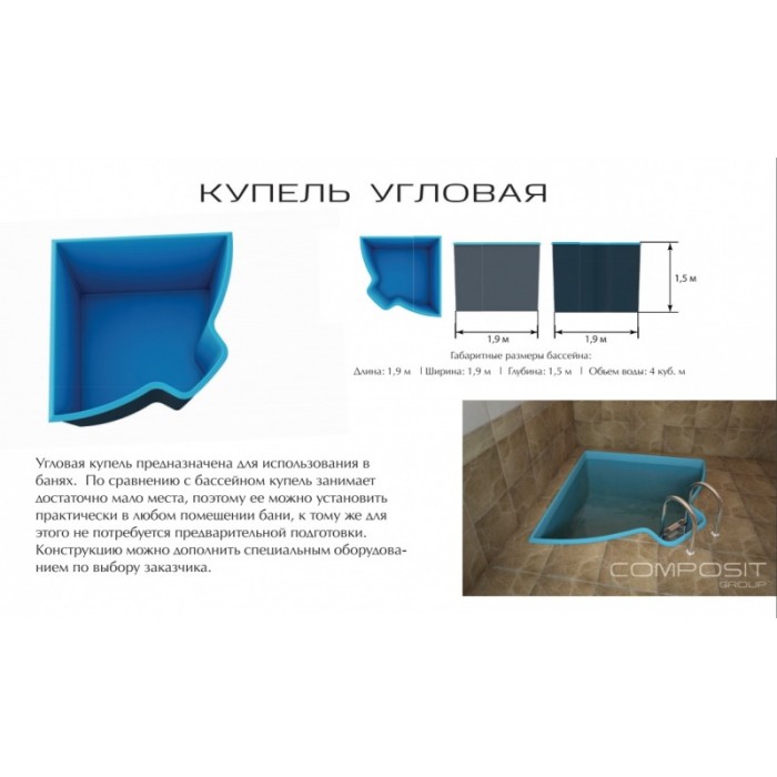 Композитный бассейн Купель угловая 1,9x1,9x1,5 PREMIUM