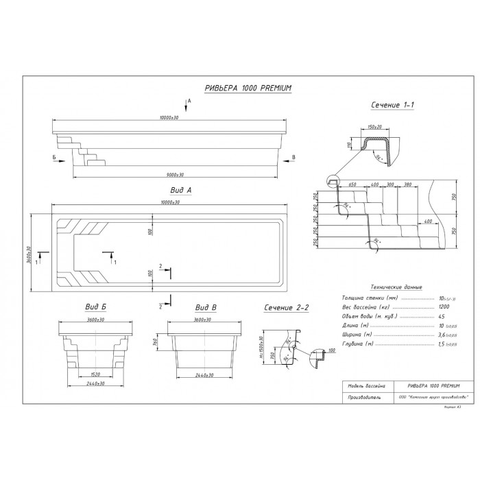 Композитный бассейн Ривьера 1000 10,0x3,6x1,5 PREMIUM