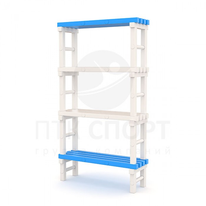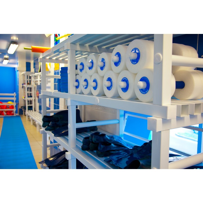 Стеллаж производства ГК «ПТК Спорт» отлично впишется в интерьер вашей раздевалки, подсобных помещений или в качестве мебели для хранения инвентаря в бассейне.