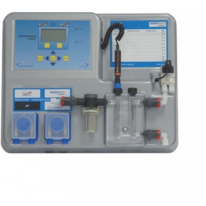Автоматическая станция дозирования Waterfriend MRD-1 (pH, активный кислород) - система для измерения и регулирования pH и дозирования активного кислорода. Система включает монитор с графическим интерфейсом и удобную для пользования навигацию. Дозирующая станция, включая электронику, pH-электрод, датчик протока, фильтр и 2 дозирующих насосов, размещена в пластиковом корпусе для настенного монтажа.