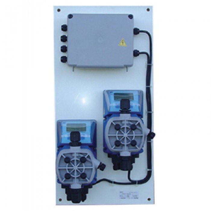 Станция использует два аналоговых дозирующих мембранных насоса Seko Tekna AKL 603 - это насосы нового поколения, предназначенные для работы в тяжелых условиях. Их гидравлическая часть выполнена из фторопласта версии "ПВДФ", что позволяет им взаимодействовать с любыми химически-агрессивными средствами без какого-либо ущерба, продлевая срок службы. В отличии от цифровых серия аналоговых насосов имеет только ручную регулировку производительности. Станция смонтирована на панели ПВХ размером (600x300x10 мм).