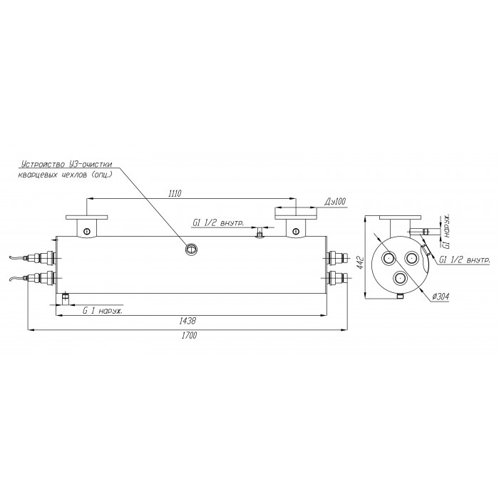 Выполненный из нержавеющей стали марки AISI-304 корпус установки оснащен расположенной внутри его рабочей камеры системой перегородок с отверстиями, обеспечивающими оптимальный режим протока и обработки воды УФ-излучением. Расходным, то есть подлежащим периодической замене элементом установок обеззараживания воды линейки УФУ являются УФ лампы ДБ-300. Их технический ресурс составляет 1.4 года (12000 часов в режиме непрерывного использования).