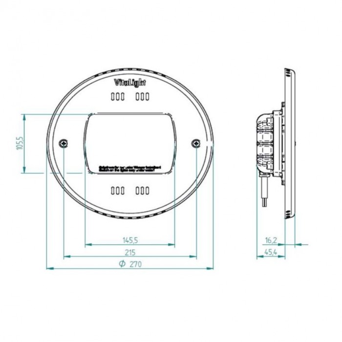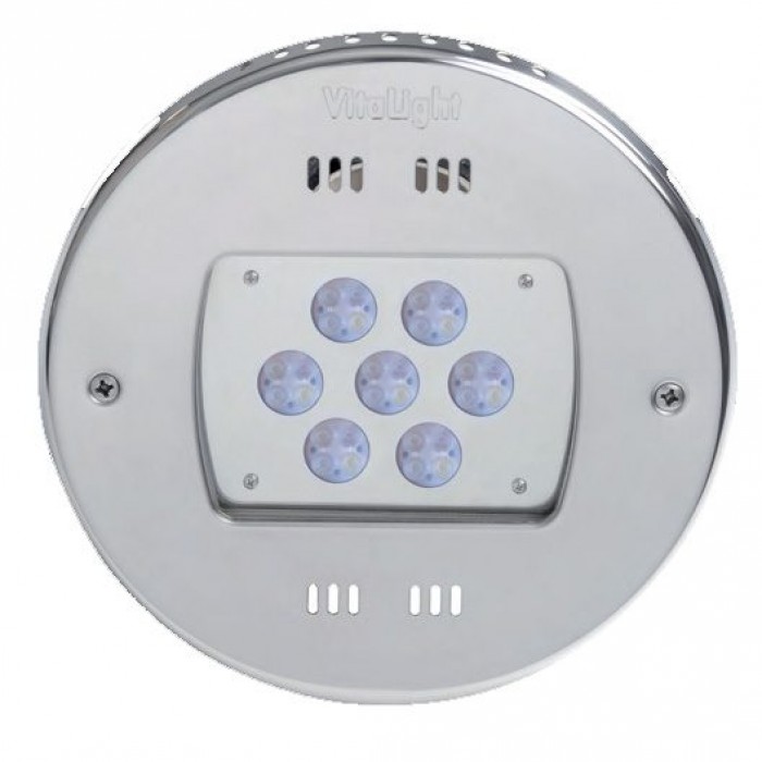 Светодиодный прожектор VitaLight (Hugo Lahme) 28/4 Power LED 3.0, 80 Вт, 24В DC, круг 270 мм, V4A, монох. 3000K, 5 м каб. 2x1,5 мм2, BZ - используется для освещения бассейнов. Может быть установлен в следующие типы бассейнов с соленой водой: