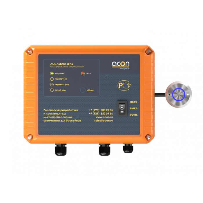 AQUASTART SENS (220В) - это пульт управления насосом 2.2 кВт, 220 В аттракциона плавательного бассейна посредством сенсорной пьезокнопки. Пульт обеспечивает защиту от перегрузки по току и от работы по «сухому ходу» (при отсутствии воды). AQUASTART SENS (220В) имеет защищенный от брызг корпус с герметичным кабельным вводом для подключения питающего и нагрузочного кабелей.