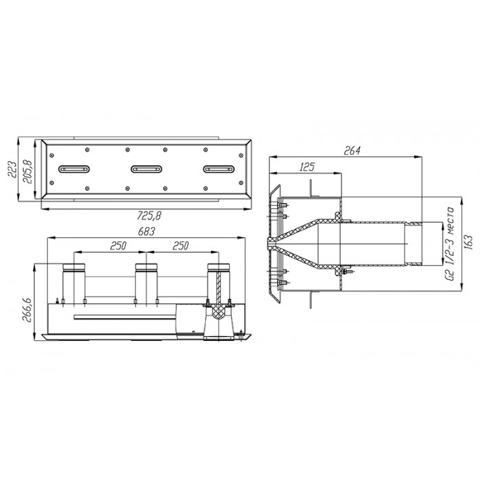 - Габаритные размеры: лицевая панель ‒ 725,8х205,8 мм, общие ‒ 725,8х266,6х223 мм;