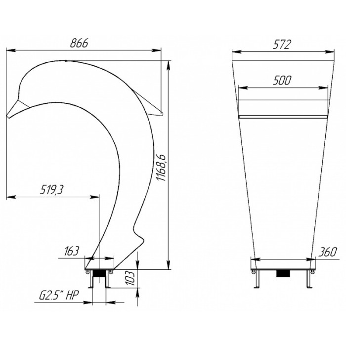 Водопад "Дельфин", выполненный из нержавеющей стали обработанной для создания эффекта "змеиная кожа", является декоративным элементом. Вода с помощью насоса забирается из бассейна, далее подается по трубам на водопад и через сопла различной формы достигается большой напор струи.