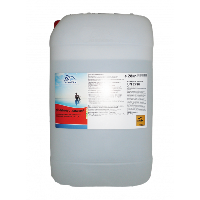 С целью снижения pH на 0,1 следует применить ок. 0,8 кг препарата/10 м3 бассейной воды. Непрерывная дозировка при помощи дозирующего кислотостойкого насоса непосредственно из заводского резервуара.